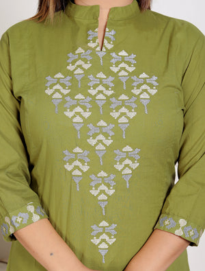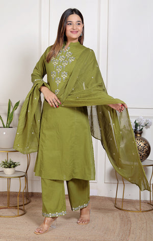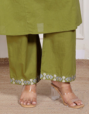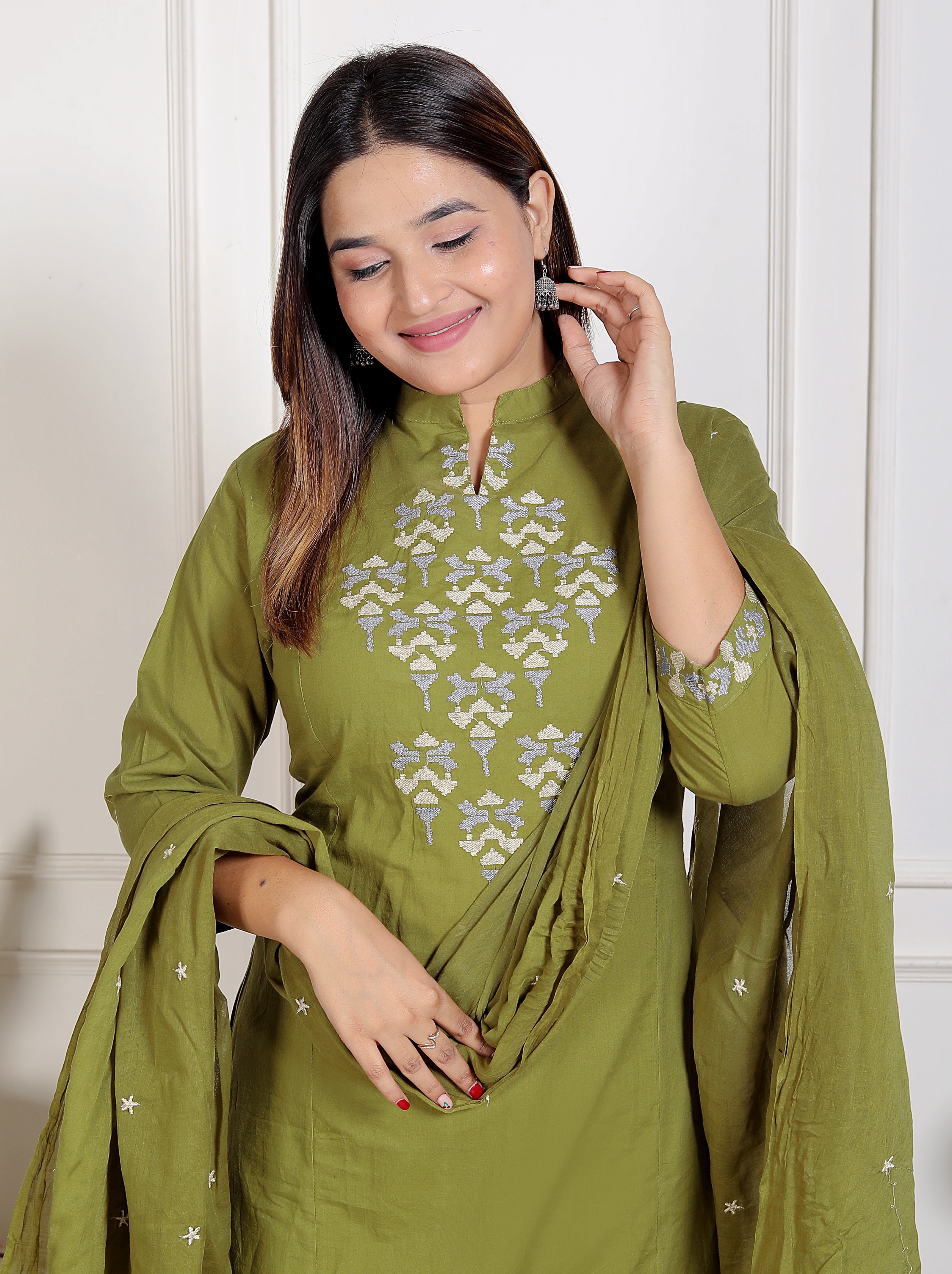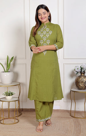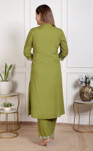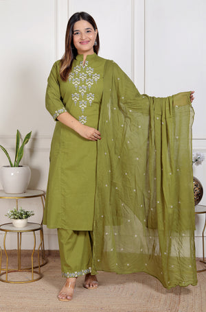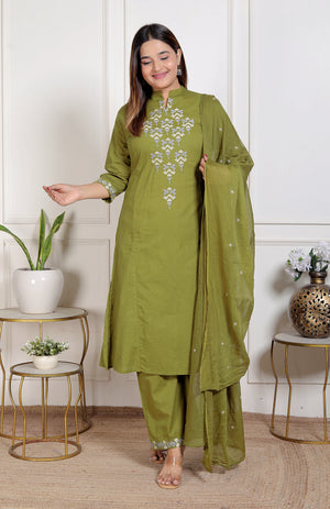 Hayat by Kham breathes ease into elegance. Crafted from pure cotton, this suit set embodies the calm rhythm of everyday elegance in the gentle hue of olive. It is soft on the skin and softer in spirit. Subtle embroidery graces the yoke, sleeves, and palazzo, like little whispers of detail meant only for those who notice. The mulmul dupatta drapes like a sigh of comfort, airy and light. Hayat is not loud. It lingers quietly, in morning errands, evening chai, and unhurried laughter. This cotton A-line suit set reflects the simplest moments of life that you have lived beautifully.