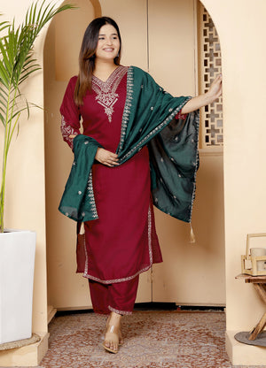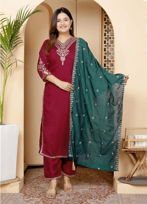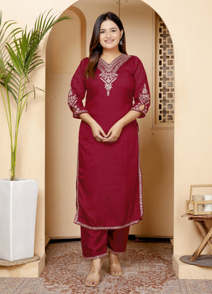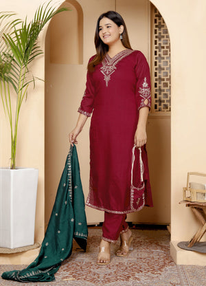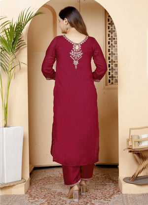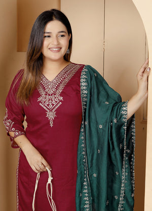 Mehrunisa by Kham is a regal festive ensemble crafted from premium Vichitra Silk that speaks luxury in every thread. This designer suit set features a heavily embroidered kurti with intricate coding work on the neckline, sleeves, and side slits, extending even to the back yoke for a complete 360° festive charm. Paired with straight-cut pants and a rich dupatta adorned with delicate embroidery, the set also comes with a matching embroidered purse, perfect for your festive essentials. Ideal for weddings and celebrations, this outfit blends traditional elegance with modern grace.