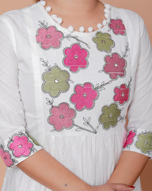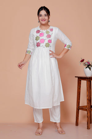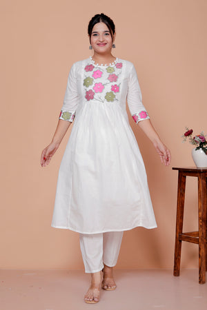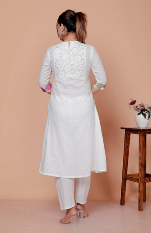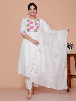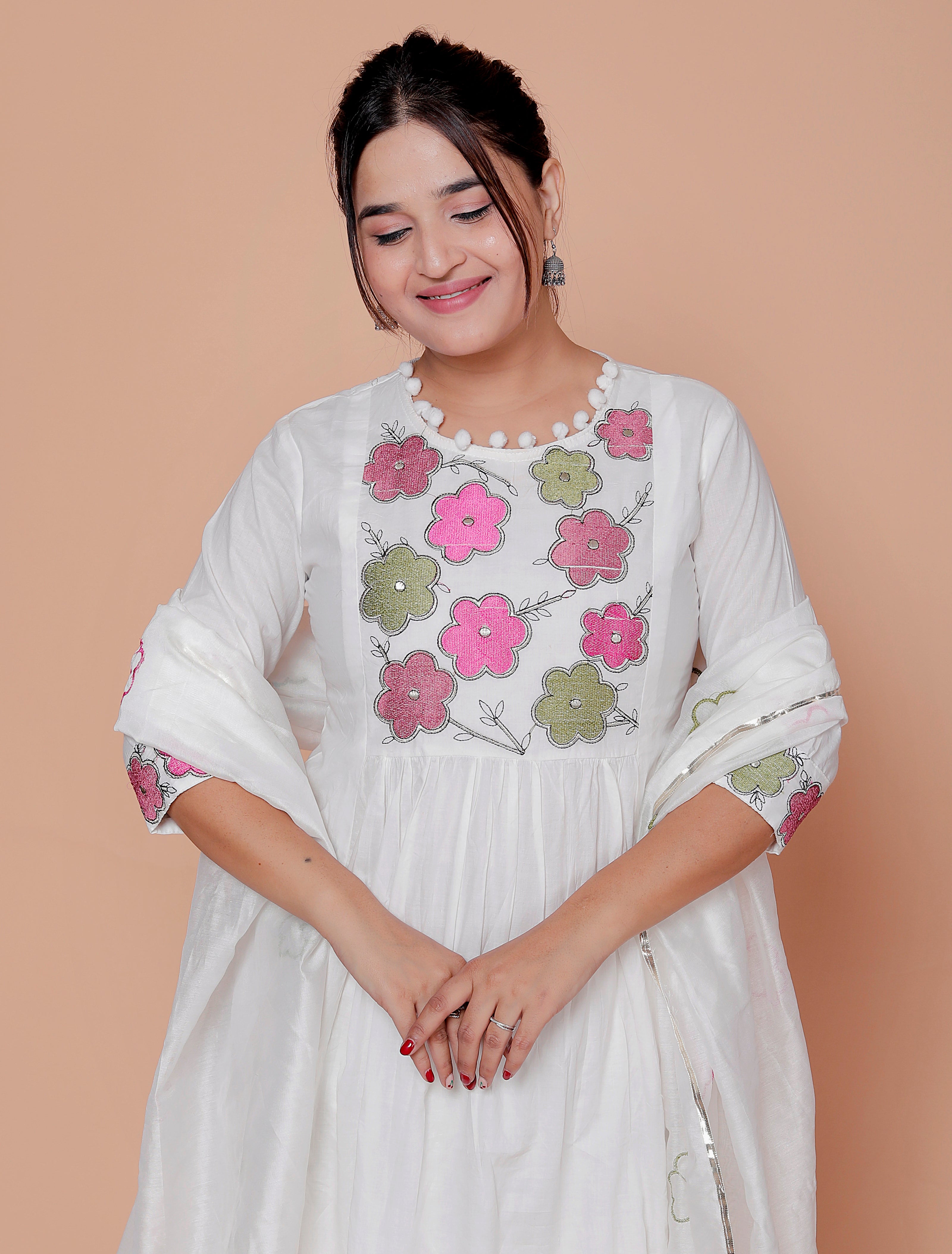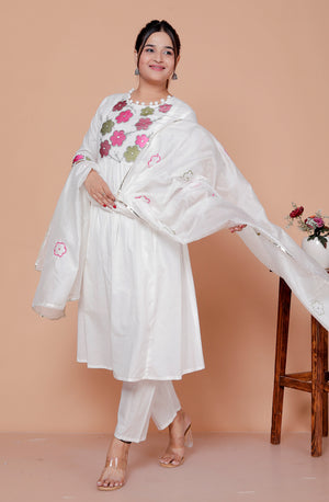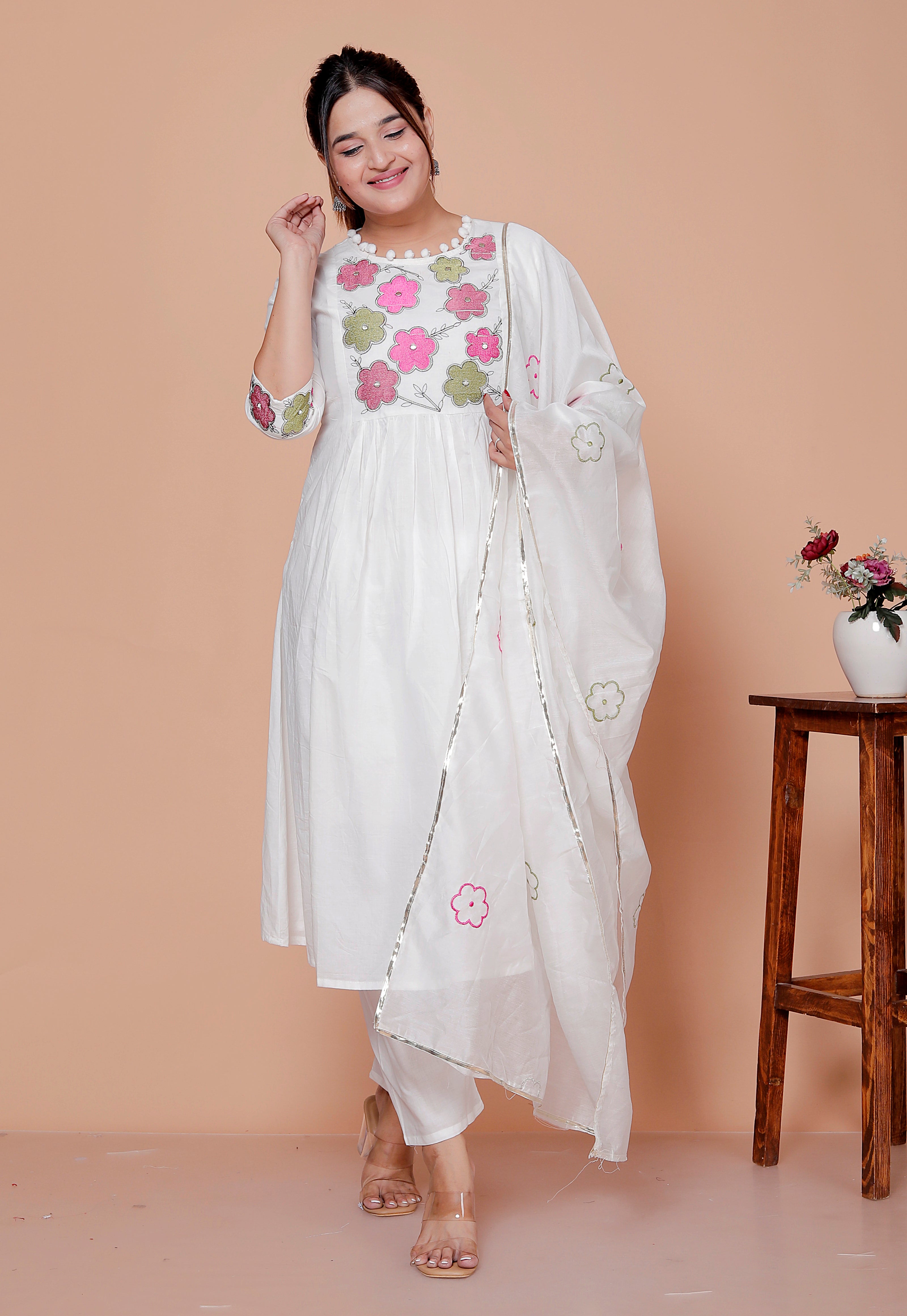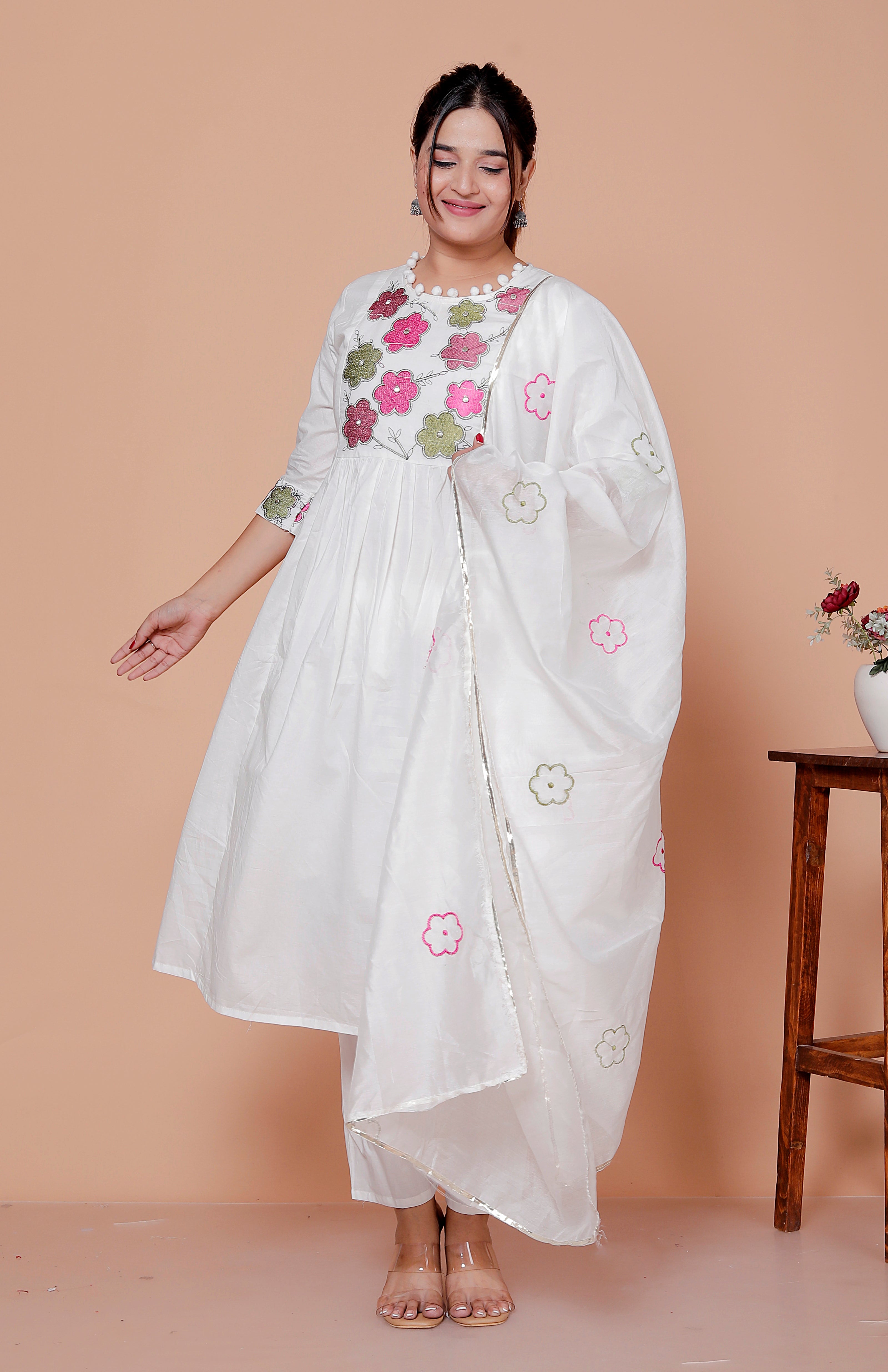 Parizad by Kham is a creation as serene as moonlight on marble. Crafted in fine cotton and adorned with delicate embroidery across the neckline, sleeves, and back, it mirrors the quiet beauty of a garden kissed by dawn. The Chanderi dupatta, laced with gota and intricate threadwork, drapes like a soft verse around the suit, unfolding the whispers of grace. Lined in mulmul for comfort and purity, Parizad is where simplicity meets splendour. The suit set is an ode to the woman who carries elegance not as ornament, but as essence.