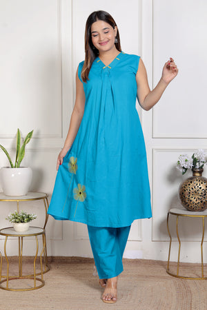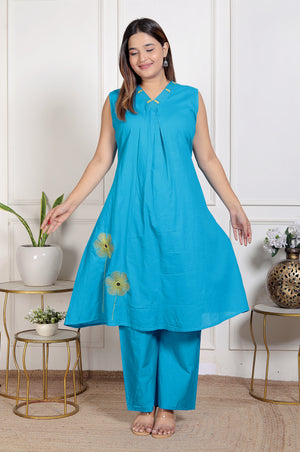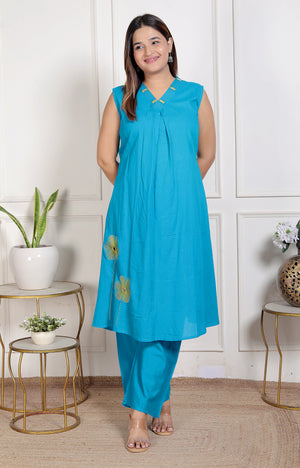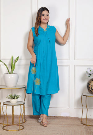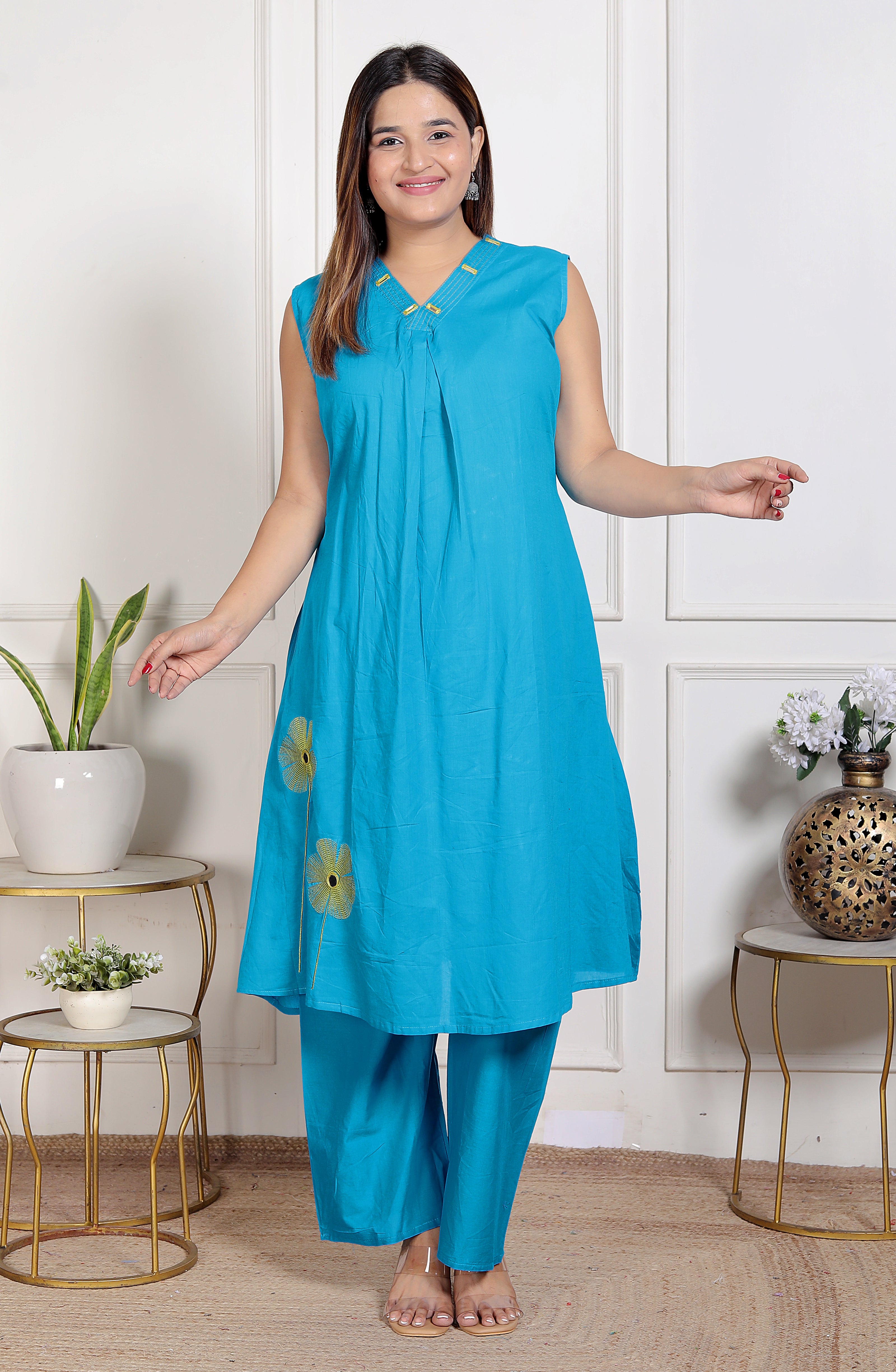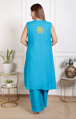 Samaa by Kham captures the calm rhythm of open skies and slow summer mornings. Crafted from pure 60/60 cotton, this elegant flared co-ord set blends comfort with artisanal grace. The mirror and floral embroidery at the front and back shimmer softly, while katha detailing along the neckline adds a subtle handcrafted charm. The sleeveless kurti with a convenient side pocket flows with ease, complemented by comfy straight pants. Ideal for daytime gatherings or relaxed festivities, Samaa embodies effortless sophistication.