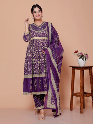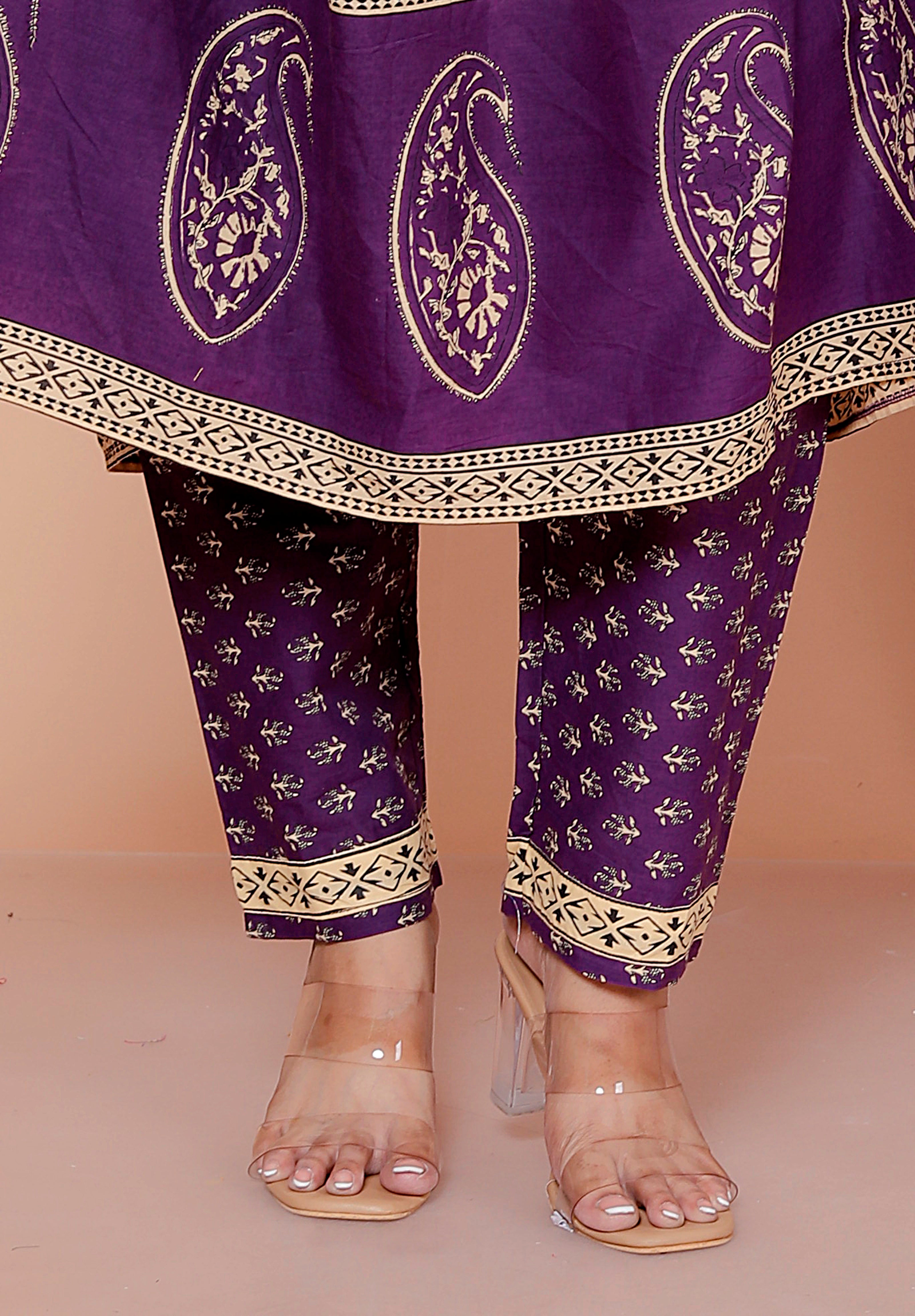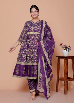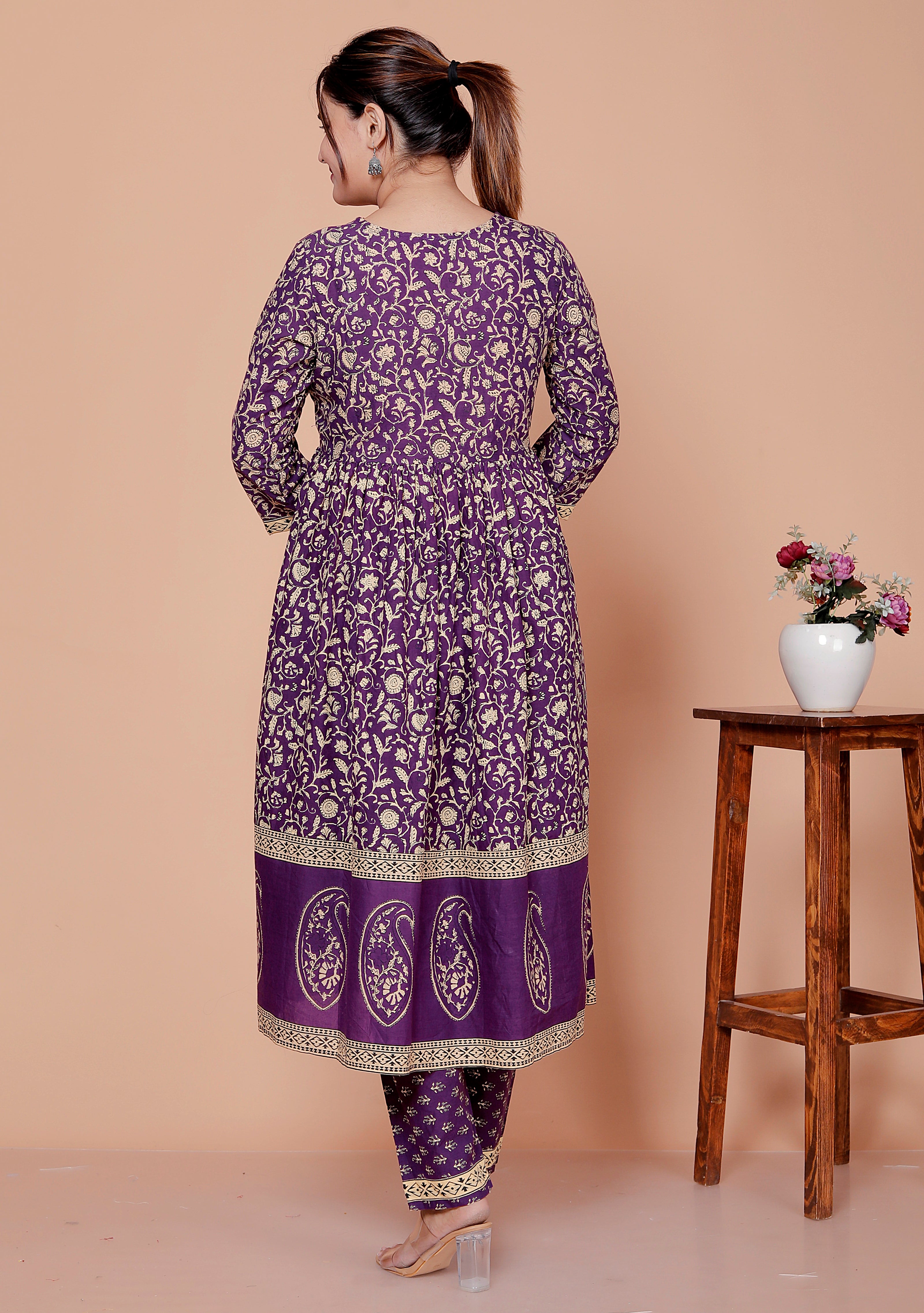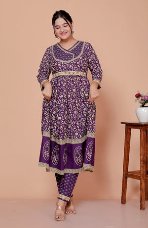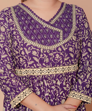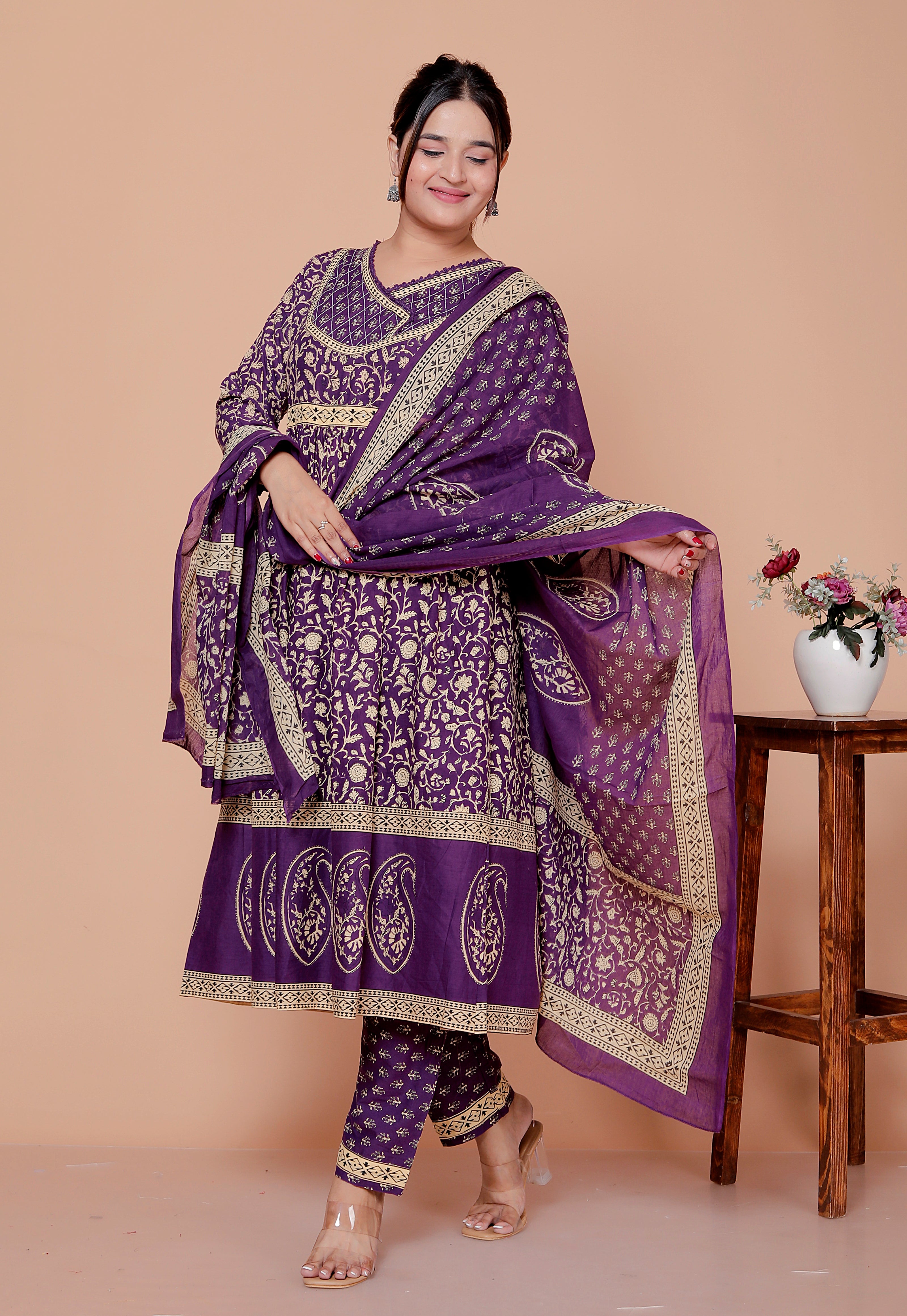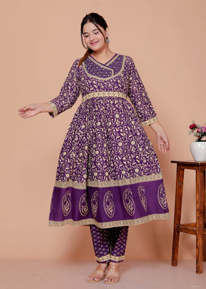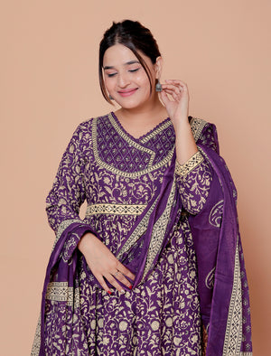 Zareen: Deep Purple Royal Cotton Angrakha Style Anarkali Suit