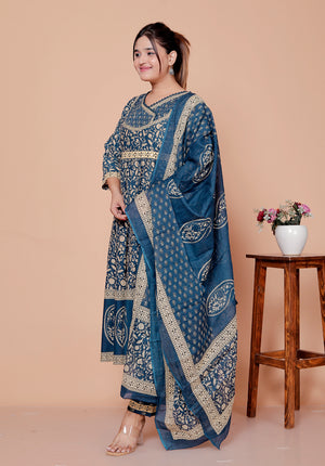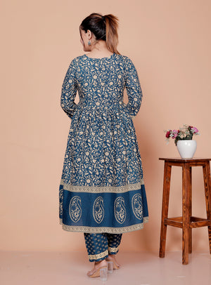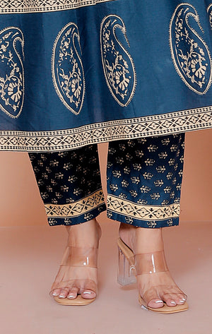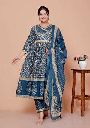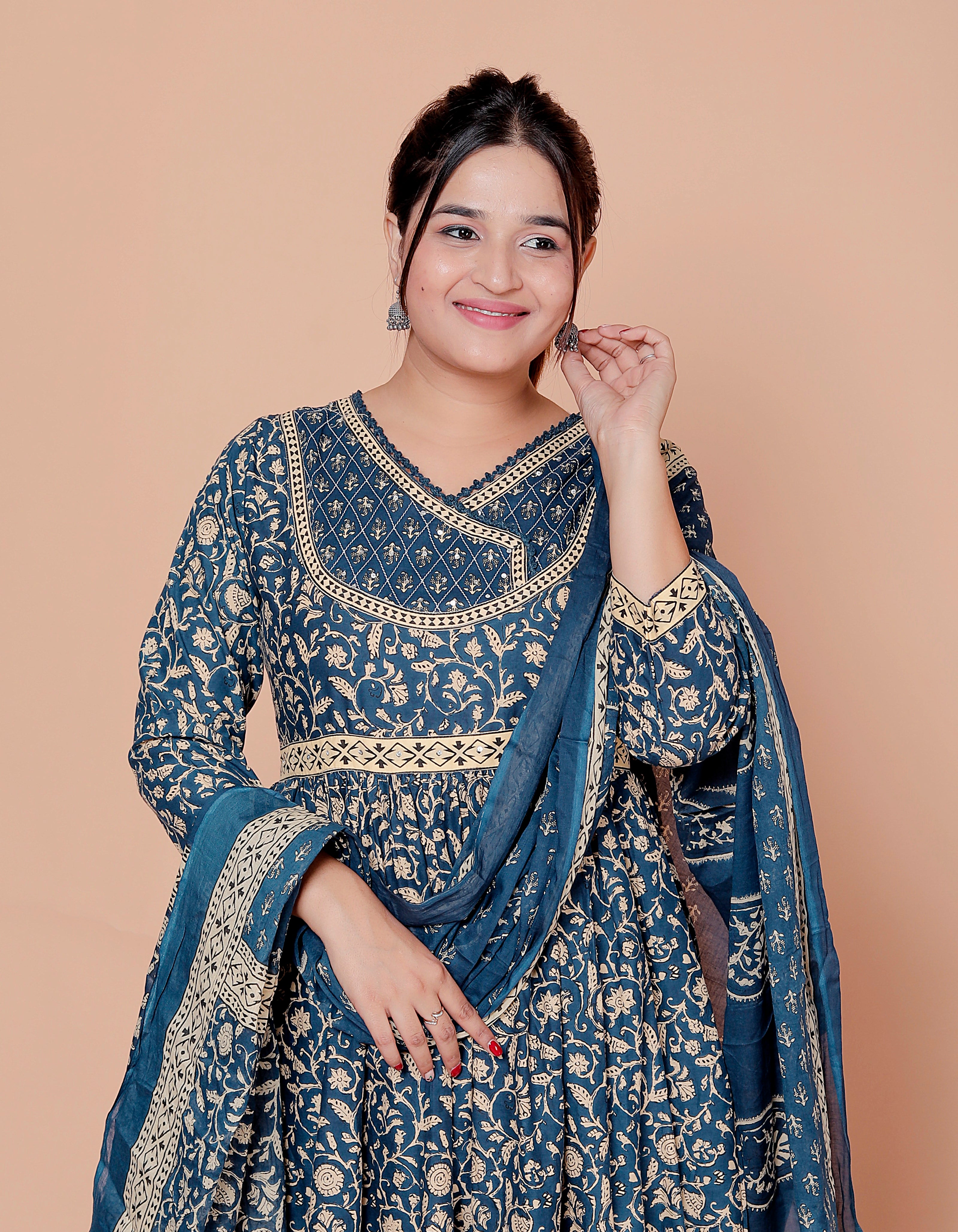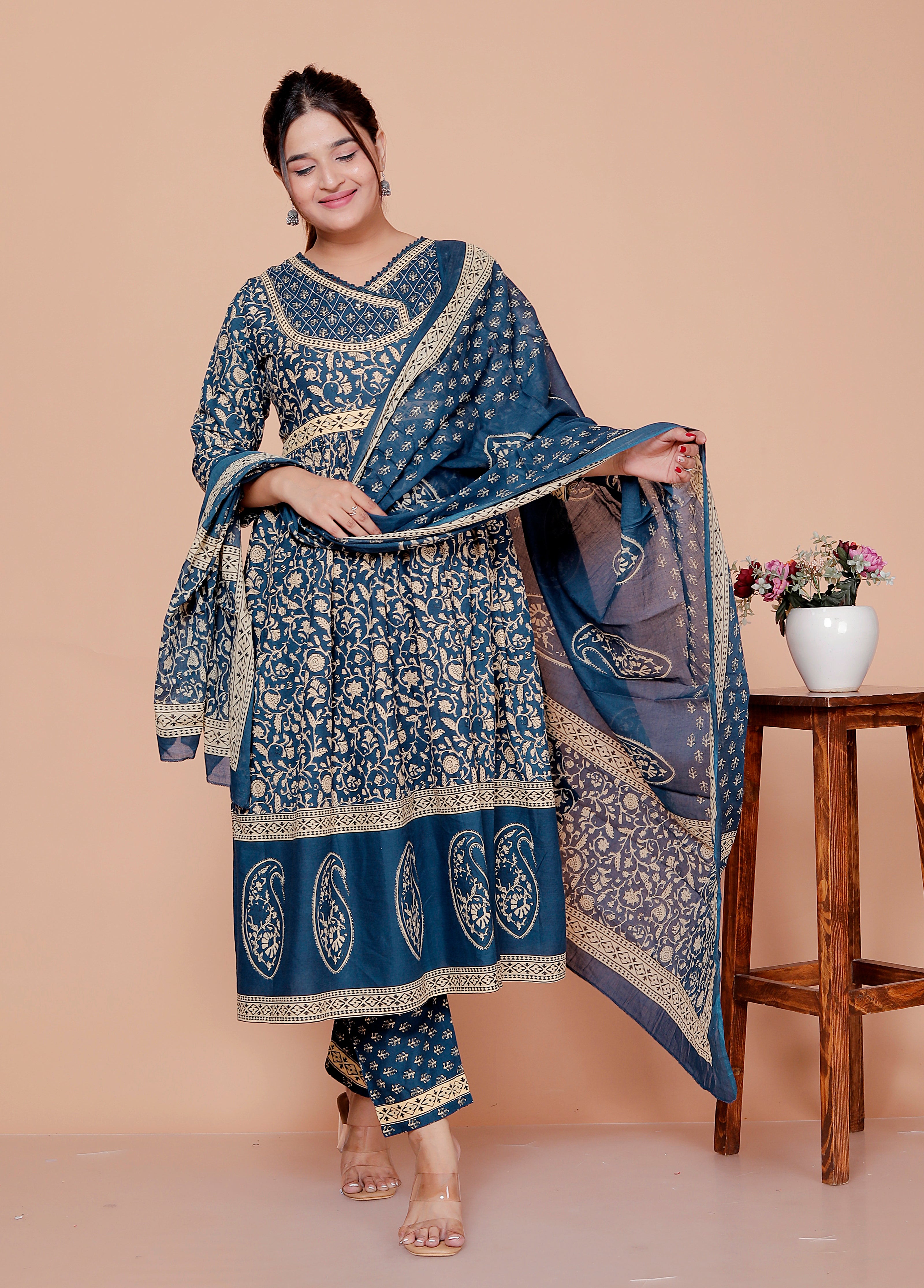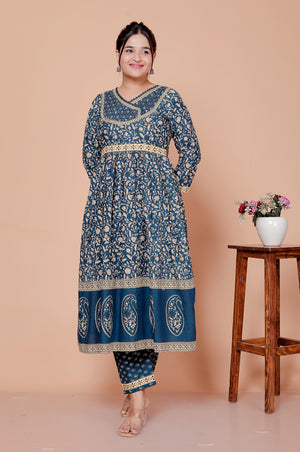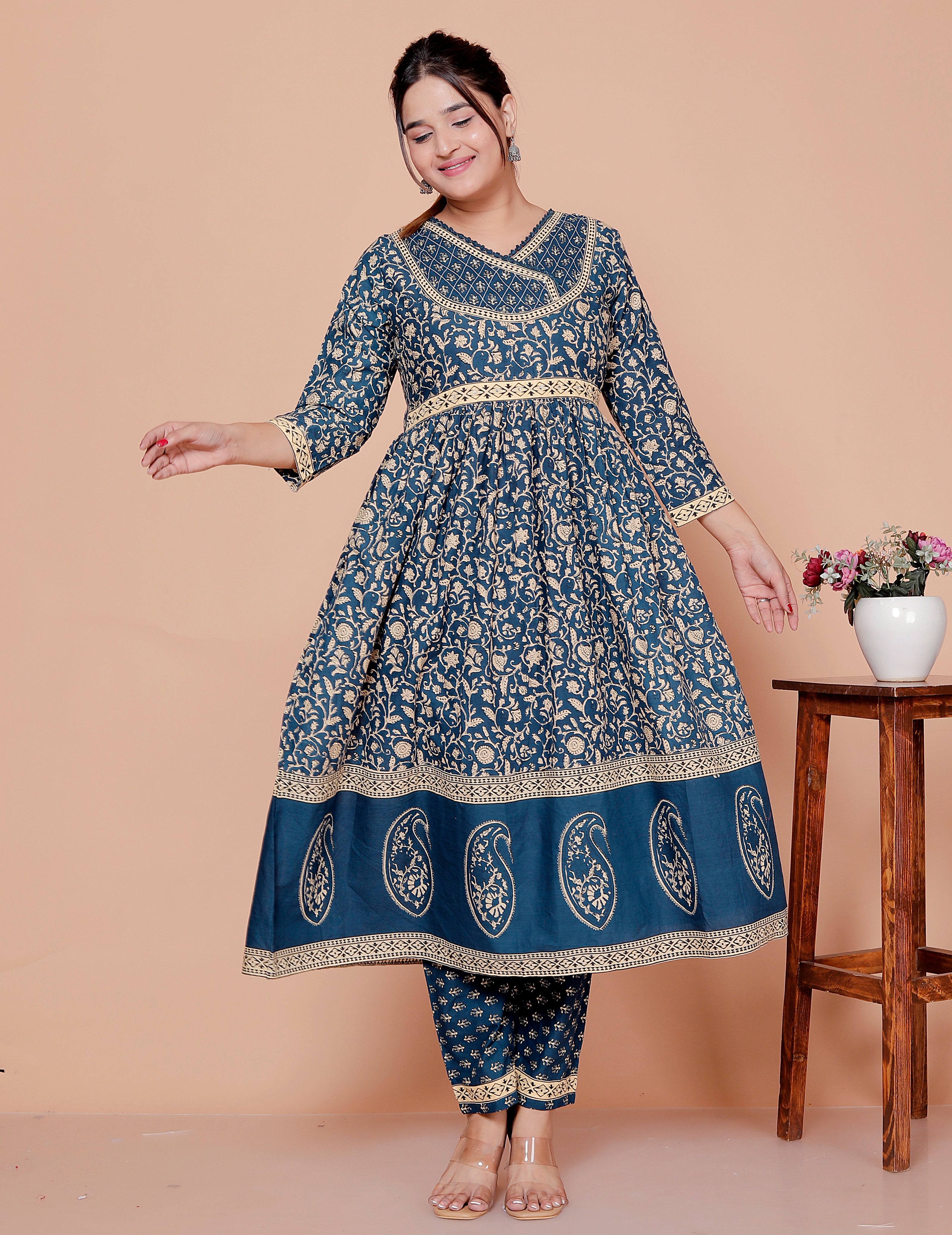 Zareen: Peacock Blue Royal Cotton Angrakha Style Anarkali Suit